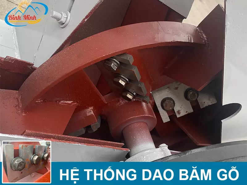 Máy được trang bị hệ thống dao băm sắc bén, dày dặn với 4 dao băm chính cùng 4 cánh đẩy lắp trên đĩa đà, tạo lực băm mạnh giúp băm nguyên liệu gỗ thành dạng dăm mảnh nhỏ một cách nhanh chóng.