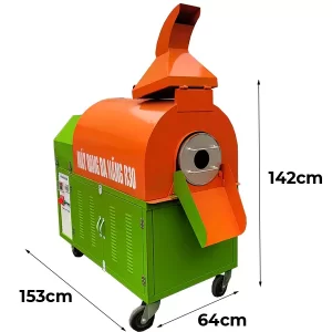 Thiết kế to rộng, mỗi mẻ rang có thể chứa được 20 đến 25 kg nguyên liệu. Kích thước lồng rang (CD*CC*đường kính): 96*53*29cm.